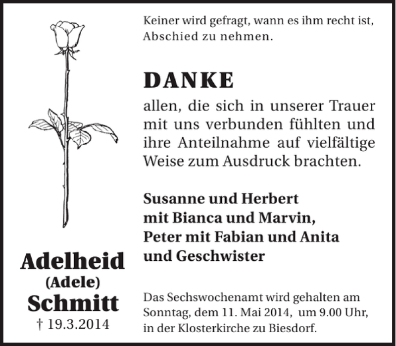 Hier finden Sie alle Traueranzeigen aus der Zeitung, die bisher für Adelheid Schmitt erschienen sind. Weitere Traueranzeigen, die in der Zeitung erscheinen, werden hier ebenfalls aufgelistet