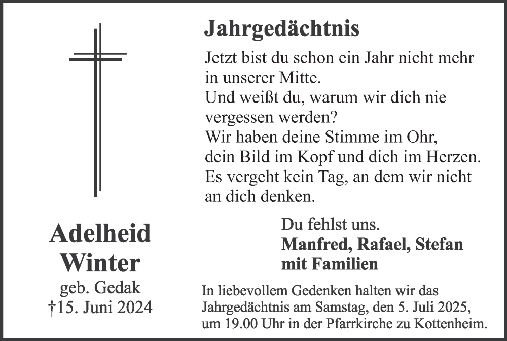 Hier finden Sie alle Traueranzeigen aus der Zeitung, die bisher für Adelheid Winter erschienen sind. Weitere Traueranzeigen, die in der Zeitung erscheinen, werden hier ebenfalls aufgelistet