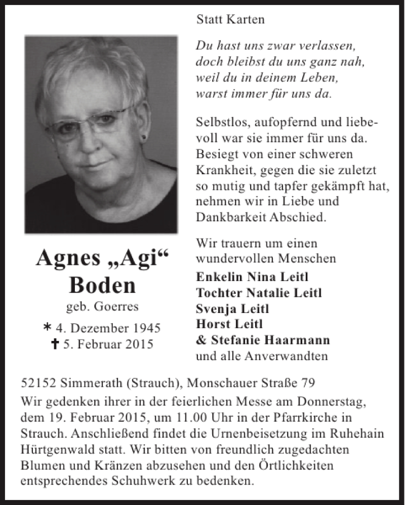 Hier finden Sie alle Traueranzeigen aus der Zeitung, die bisher für Agnes Agi Boden erschienen sind. Weitere Traueranzeigen, die in der Zeitung erscheinen, werden hier ebenfalls aufgelistet