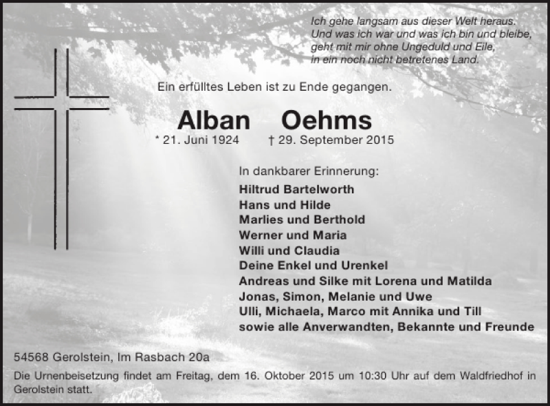 Hier finden Sie alle Traueranzeigen aus der Zeitung, die bisher für Alban Oehms erschienen sind. Weitere Traueranzeigen, die in der Zeitung erscheinen, werden hier ebenfalls aufgelistet