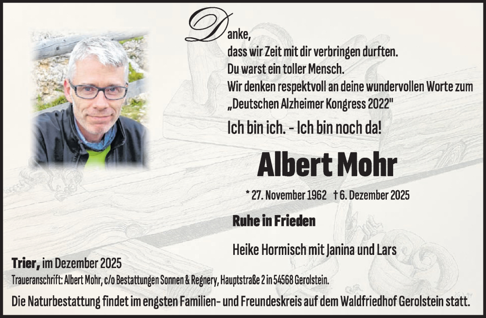Hier finden Sie alle Traueranzeigen aus der Zeitung, die bisher für Albert Mohr erschienen sind. Weitere Traueranzeigen, die in der Zeitung erscheinen, werden hier ebenfalls aufgelistet