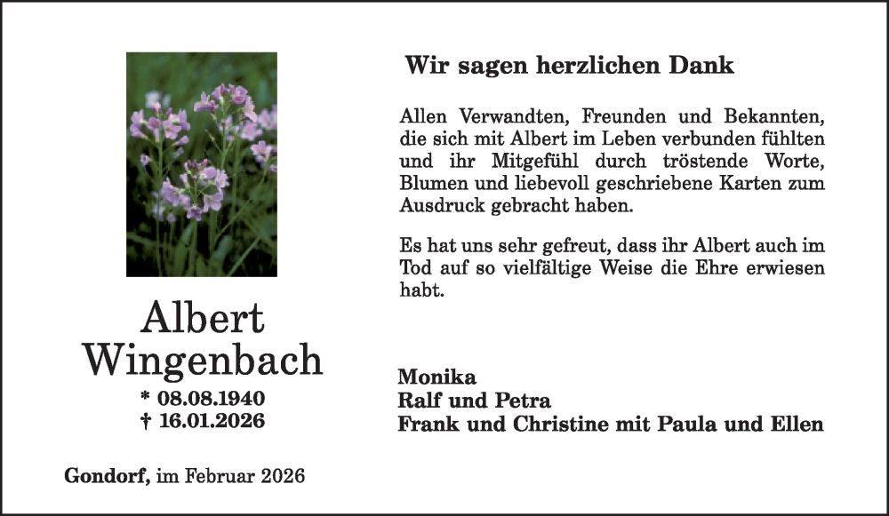 Hier finden Sie alle Traueranzeigen aus der Zeitung, die bisher für Albert Wingenbach erschienen sind. Weitere Traueranzeigen, die in der Zeitung erscheinen, werden hier ebenfalls aufgelistet