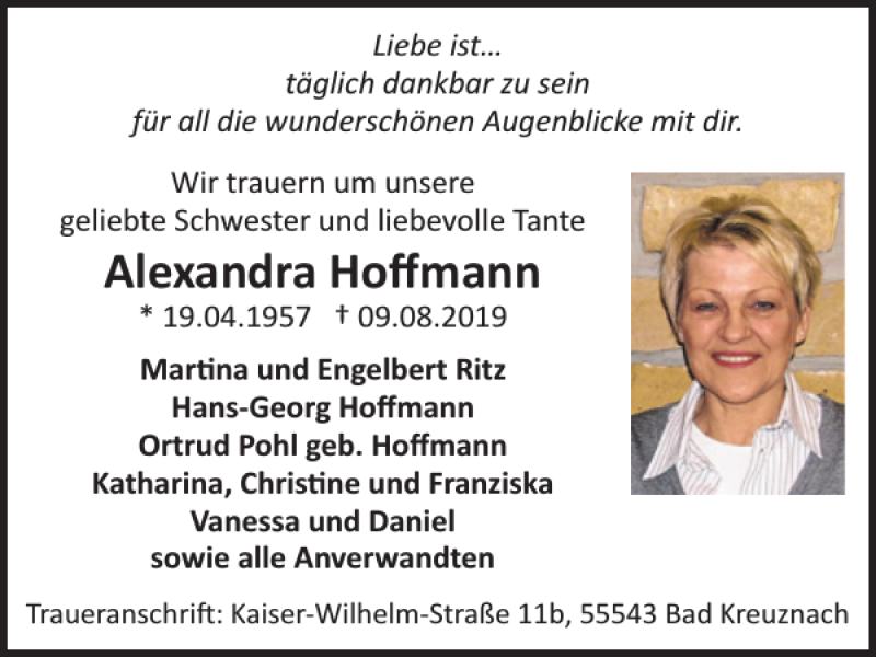 Hier finden Sie alle Traueranzeigen aus der Zeitung, die bisher für Alexandra Hoffmann erschienen sind. Weitere Traueranzeigen, die in der Zeitung erscheinen, werden hier ebenfalls aufgelistet