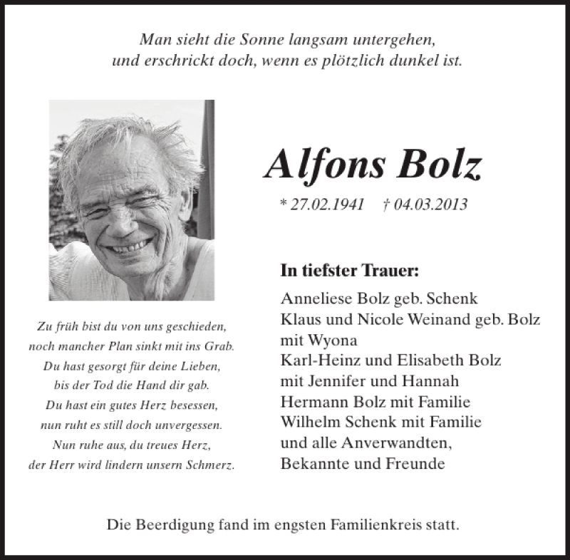 Hier finden Sie alle Traueranzeigen aus der Zeitung, die bisher für Alfons Bolz erschienen sind. Weitere Traueranzeigen, die in der Zeitung erscheinen, werden hier ebenfalls aufgelistet