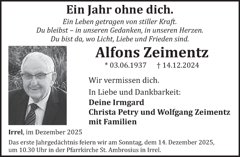Hier finden Sie alle Traueranzeigen aus der Zeitung, die bisher für Alfons Zeimentz erschienen sind. Weitere Traueranzeigen, die in der Zeitung erscheinen, werden hier ebenfalls aufgelistet