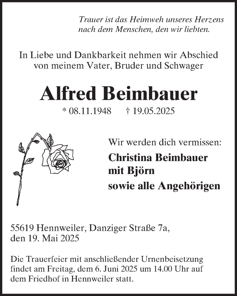 Hier finden Sie alle Traueranzeigen aus der Zeitung, die bisher für Alfred Beimbauer erschienen sind. Weitere Traueranzeigen, die in der Zeitung erscheinen, werden hier ebenfalls aufgelistet