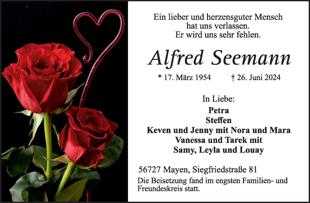 Hier finden Sie alle Traueranzeigen aus der Zeitung, die bisher für Alfred Seemann erschienen sind. Weitere Traueranzeigen, die in der Zeitung erscheinen, werden hier ebenfalls aufgelistet