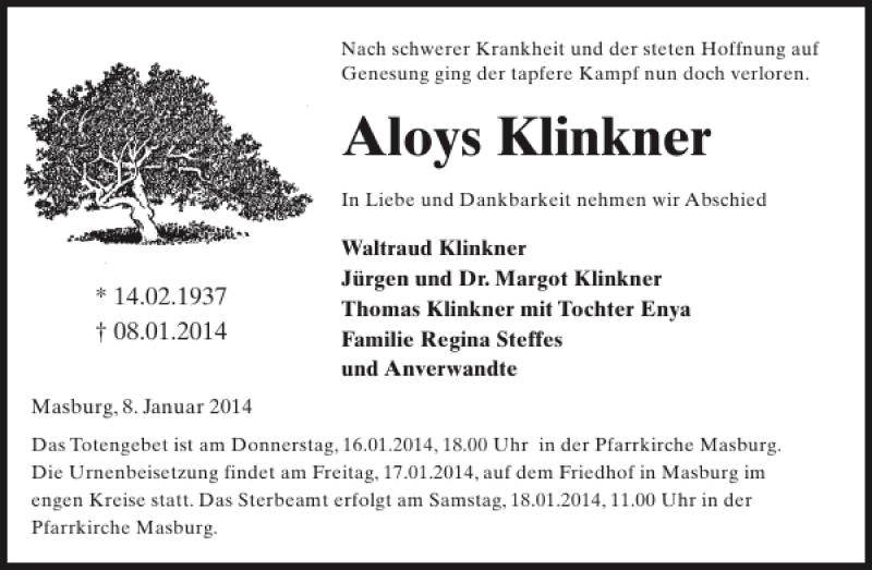 Hier finden Sie alle Traueranzeigen aus der Zeitung, die bisher für Aloys Klinkner erschienen sind. Weitere Traueranzeigen, die in der Zeitung erscheinen, werden hier ebenfalls aufgelistet