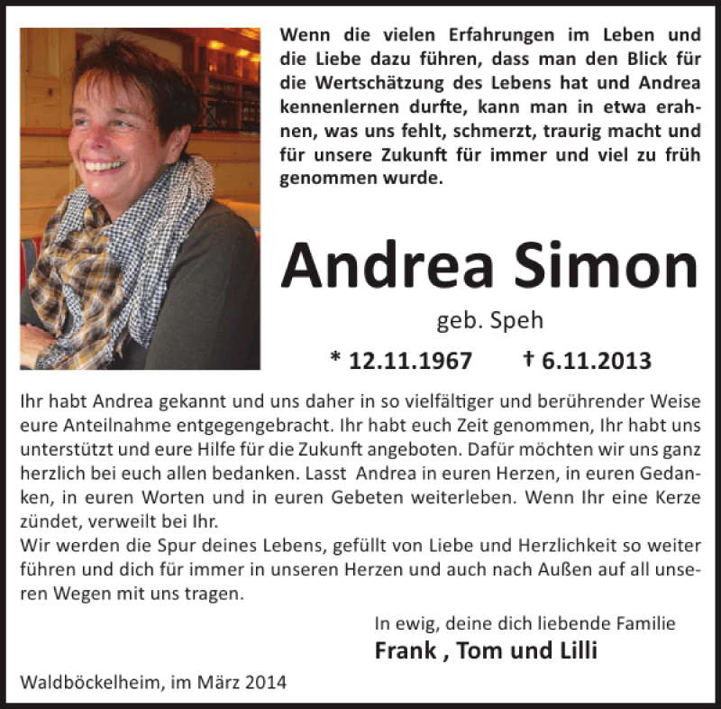 Hier finden Sie alle Traueranzeigen aus der Zeitung, die bisher für Andrea Simon erschienen sind. Weitere Traueranzeigen, die in der Zeitung erscheinen, werden hier ebenfalls aufgelistet