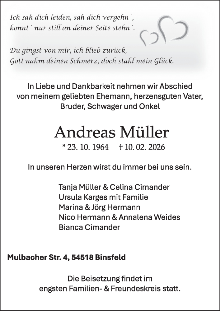 Hier finden Sie alle Traueranzeigen aus der Zeitung, die bisher für Andreas Müller erschienen sind. Weitere Traueranzeigen, die in der Zeitung erscheinen, werden hier ebenfalls aufgelistet