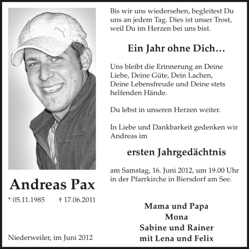Hier finden Sie alle Traueranzeigen aus der Zeitung, die bisher für Andreas Pax erschienen sind. Weitere Traueranzeigen, die in der Zeitung erscheinen, werden hier ebenfalls aufgelistet