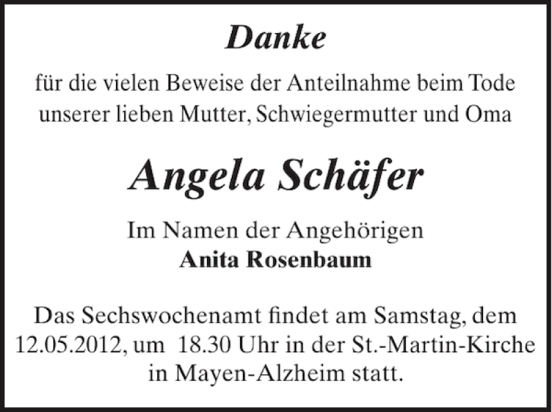Hier finden Sie alle Traueranzeigen aus der Zeitung, die bisher für Angela Schäfer erschienen sind. Weitere Traueranzeigen, die in der Zeitung erscheinen, werden hier ebenfalls aufgelistet
