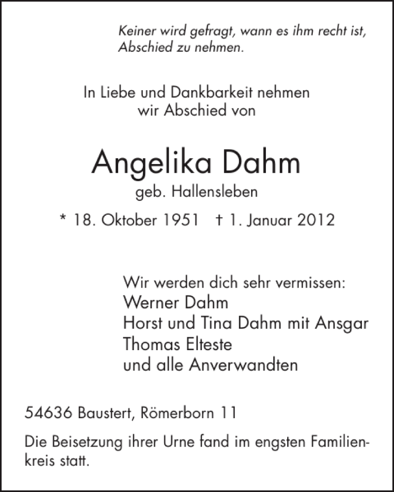Hier finden Sie alle Traueranzeigen aus der Zeitung, die bisher für Angelika Dahm erschienen sind. Weitere Traueranzeigen, die in der Zeitung erscheinen, werden hier ebenfalls aufgelistet