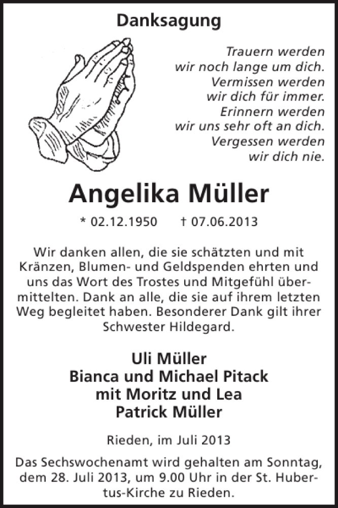 Hier finden Sie alle Traueranzeigen aus der Zeitung, die bisher für Angelika Müller erschienen sind. Weitere Traueranzeigen, die in der Zeitung erscheinen, werden hier ebenfalls aufgelistet