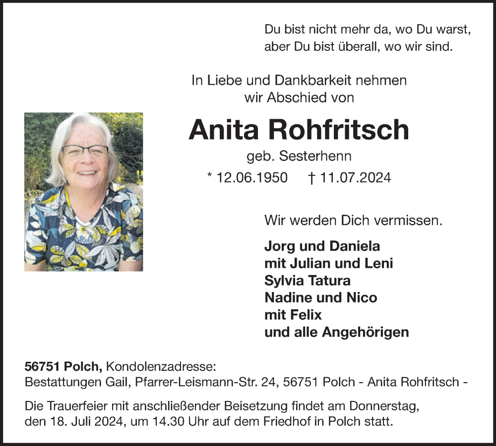 Hier finden Sie alle Traueranzeigen aus der Zeitung, die bisher für Anita Rohfritsch erschienen sind. Weitere Traueranzeigen, die in der Zeitung erscheinen, werden hier ebenfalls aufgelistet