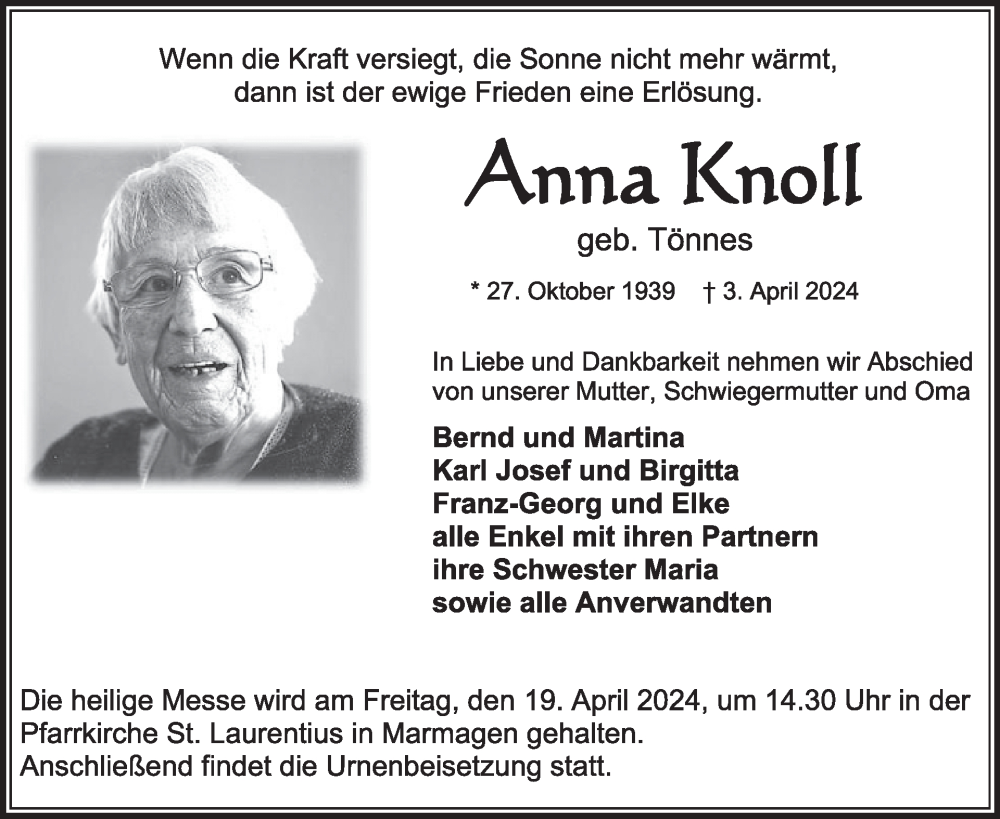 Hier finden Sie alle Traueranzeigen aus der Zeitung, die bisher für Anna Knoll erschienen sind. Weitere Traueranzeigen, die in der Zeitung erscheinen, werden hier ebenfalls aufgelistet