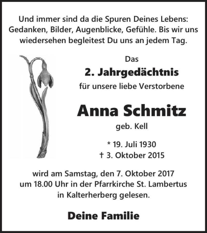 Hier finden Sie alle Traueranzeigen aus der Zeitung, die bisher für Anna Schmitz erschienen sind. Weitere Traueranzeigen, die in der Zeitung erscheinen, werden hier ebenfalls aufgelistet