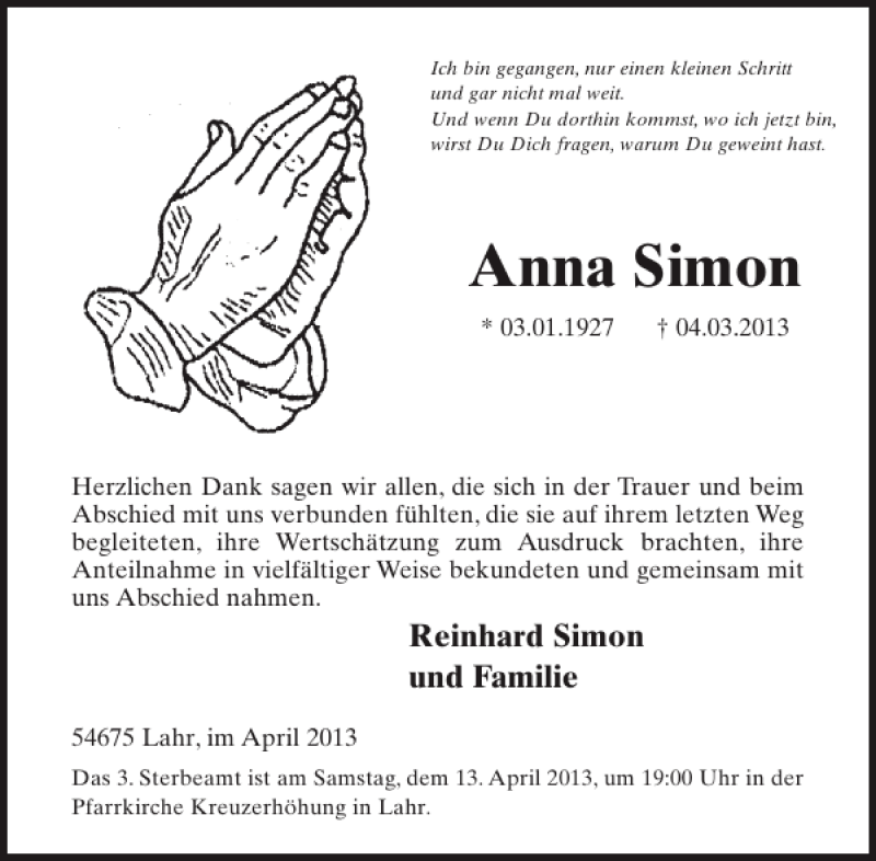 Hier finden Sie alle Traueranzeigen aus der Zeitung, die bisher für Anna Simon erschienen sind. Weitere Traueranzeigen, die in der Zeitung erscheinen, werden hier ebenfalls aufgelistet