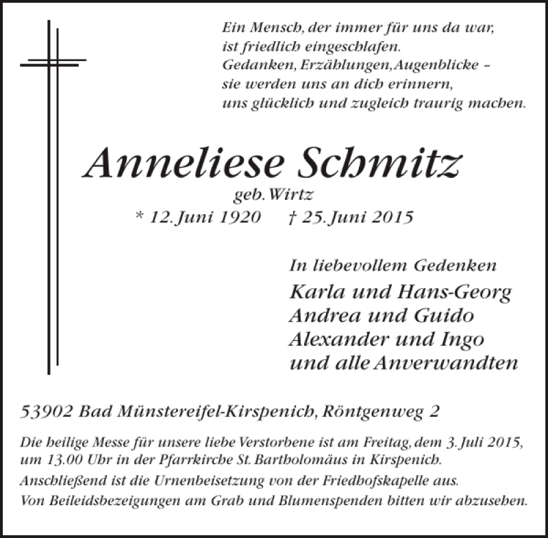 Hier finden Sie alle Traueranzeigen aus der Zeitung, die bisher für Anneliese Schmitz erschienen sind. Weitere Traueranzeigen, die in der Zeitung erscheinen, werden hier ebenfalls aufgelistet