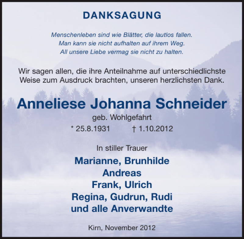 Hier finden Sie alle Traueranzeigen aus der Zeitung, die bisher für Anneliese Johanna Schneider erschienen sind. Weitere Traueranzeigen, die in der Zeitung erscheinen, werden hier ebenfalls aufgelistet