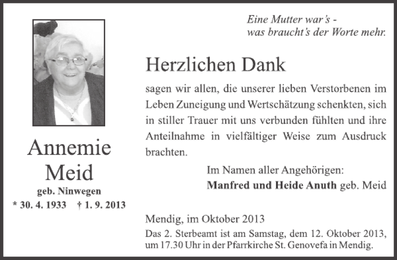 Hier finden Sie alle Traueranzeigen aus der Zeitung, die bisher für Annemie Meid erschienen sind. Weitere Traueranzeigen, die in der Zeitung erscheinen, werden hier ebenfalls aufgelistet