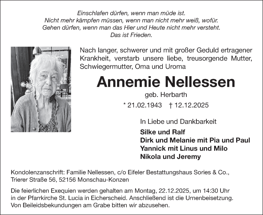 Hier finden Sie alle Traueranzeigen aus der Zeitung, die bisher für Annemie Nellessen erschienen sind. Weitere Traueranzeigen, die in der Zeitung erscheinen, werden hier ebenfalls aufgelistet