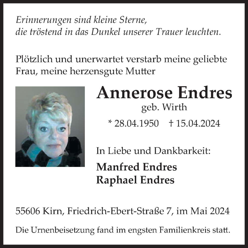 Hier finden Sie alle Traueranzeigen aus der Zeitung, die bisher für Annerose Endres erschienen sind. Weitere Traueranzeigen, die in der Zeitung erscheinen, werden hier ebenfalls aufgelistet