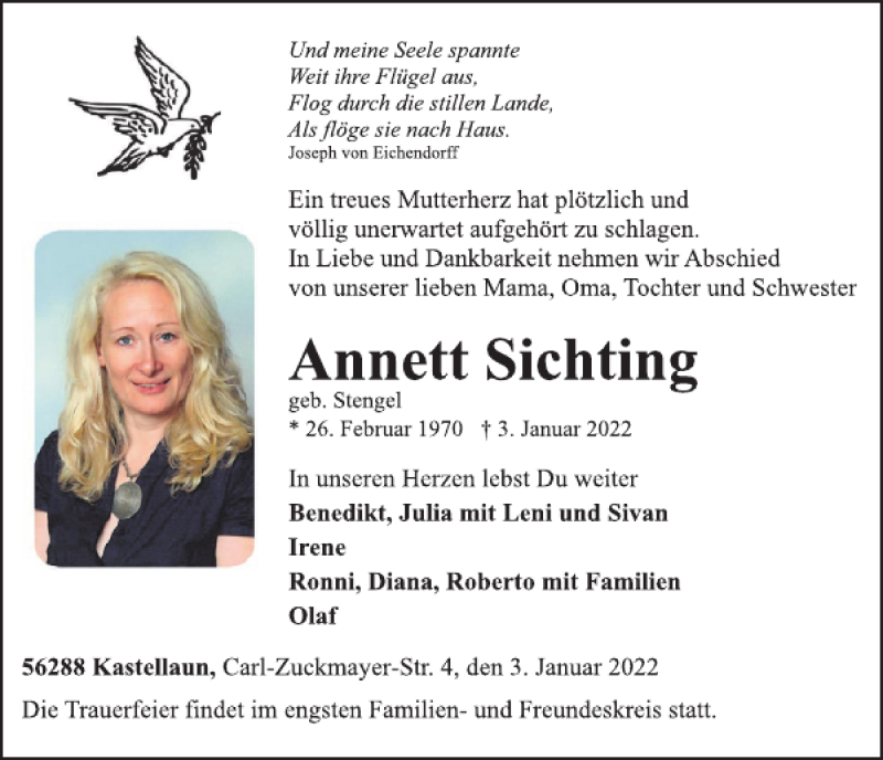 Hier finden Sie alle Traueranzeigen aus der Zeitung, die bisher für Annett Sichting erschienen sind. Weitere Traueranzeigen, die in der Zeitung erscheinen, werden hier ebenfalls aufgelistet