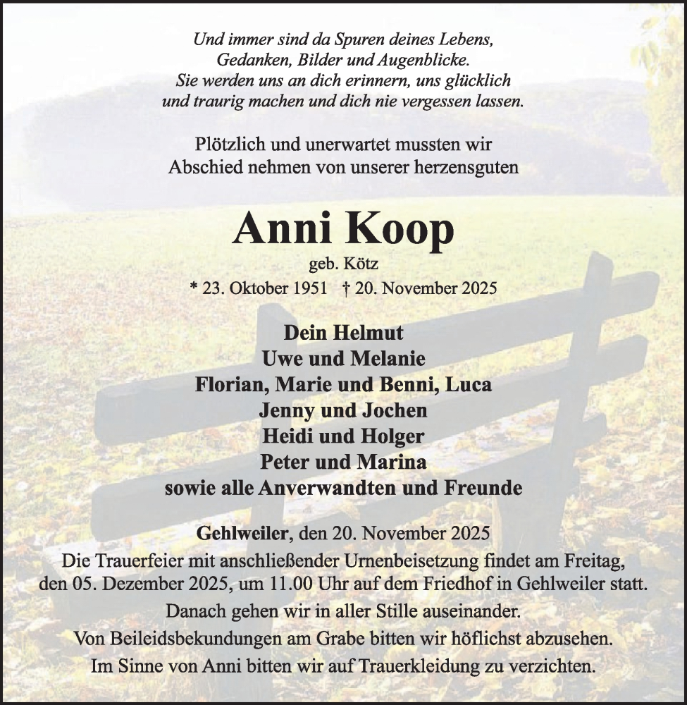 Hier finden Sie alle Traueranzeigen aus der Zeitung, die bisher für Anni Koop erschienen sind. Weitere Traueranzeigen, die in der Zeitung erscheinen, werden hier ebenfalls aufgelistet