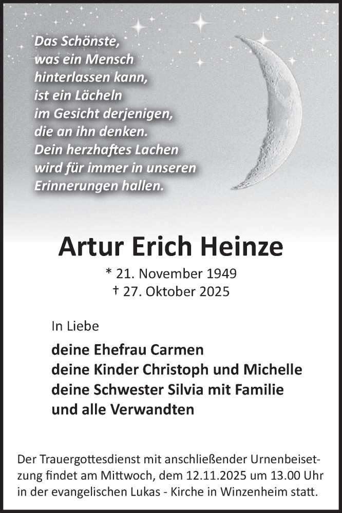 Hier finden Sie alle Traueranzeigen aus der Zeitung, die bisher für Artur Erich Heinze erschienen sind. Weitere Traueranzeigen, die in der Zeitung erscheinen, werden hier ebenfalls aufgelistet