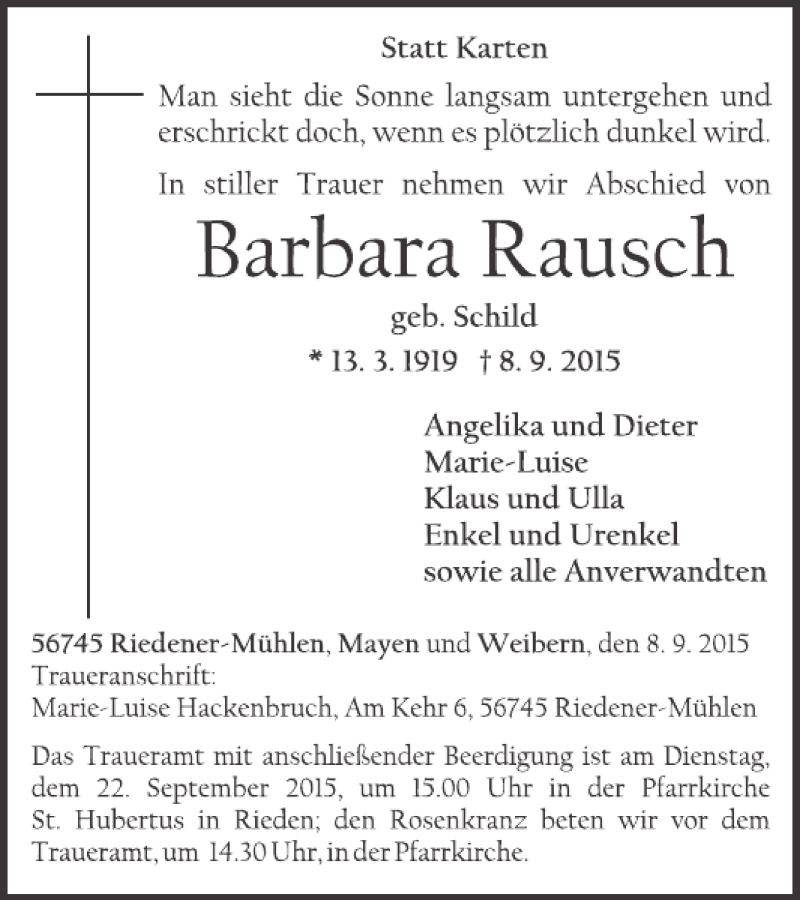 Hier finden Sie alle Traueranzeigen aus der Zeitung, die bisher für Barbara Rausch erschienen sind. Weitere Traueranzeigen, die in der Zeitung erscheinen, werden hier ebenfalls aufgelistet