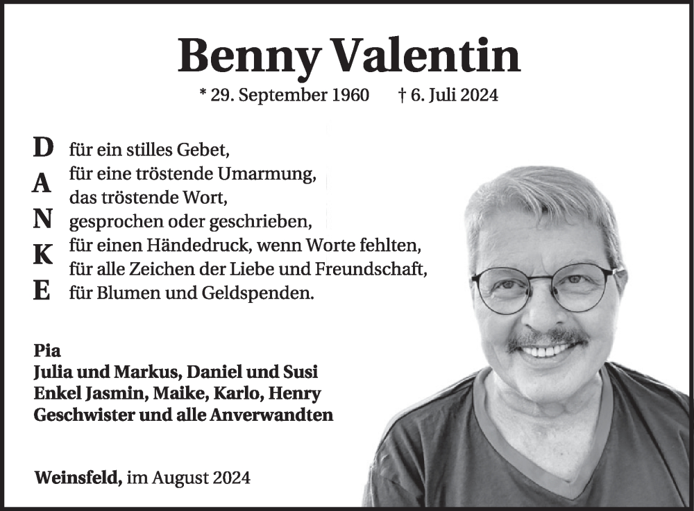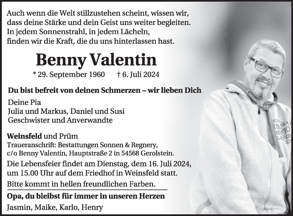 Hier finden Sie alle Traueranzeigen aus der Zeitung, die bisher für Benny Valentin erschienen sind. Weitere Traueranzeigen, die in der Zeitung erscheinen, werden hier ebenfalls aufgelistet