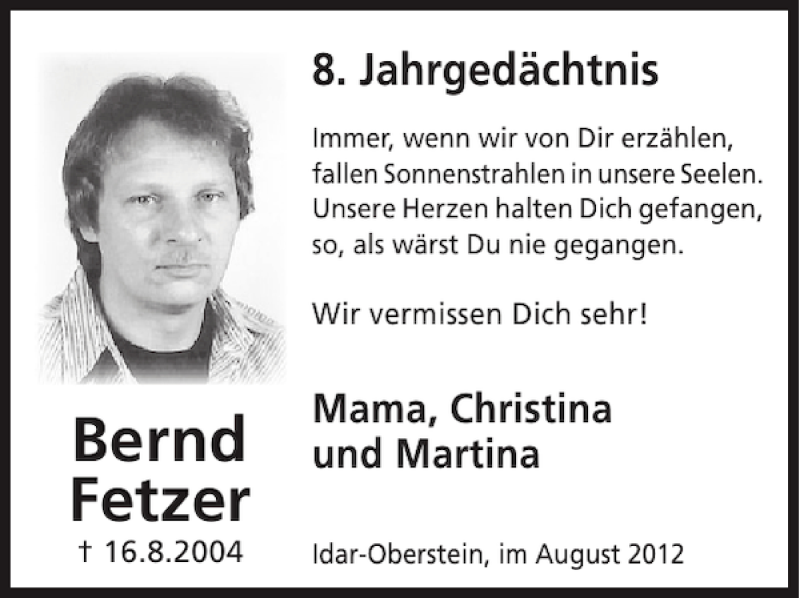 Hier finden Sie alle Traueranzeigen aus der Zeitung, die bisher für Bernd Fetzer erschienen sind. Weitere Traueranzeigen, die in der Zeitung erscheinen, werden hier ebenfalls aufgelistet