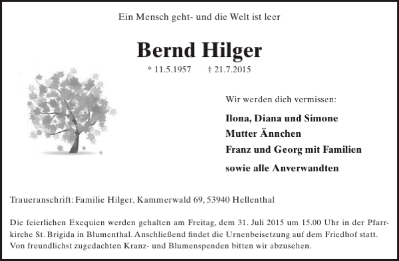 Hier finden Sie alle Traueranzeigen aus der Zeitung, die bisher für Bernd Hilger erschienen sind. Weitere Traueranzeigen, die in der Zeitung erscheinen, werden hier ebenfalls aufgelistet