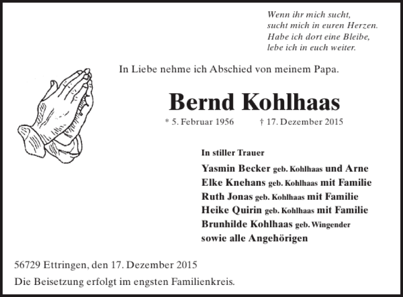 Hier finden Sie alle Traueranzeigen aus der Zeitung, die bisher für Bernd Kohlhaas erschienen sind. Weitere Traueranzeigen, die in der Zeitung erscheinen, werden hier ebenfalls aufgelistet