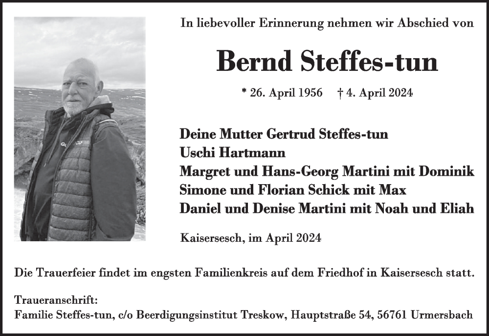 Hier finden Sie alle Traueranzeigen aus der Zeitung, die bisher für Bernd Steffes-tun erschienen sind. Weitere Traueranzeigen, die in der Zeitung erscheinen, werden hier ebenfalls aufgelistet