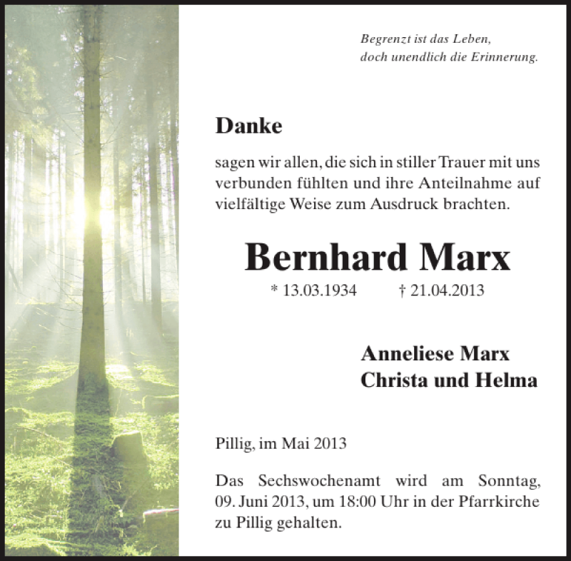 Hier finden Sie alle Traueranzeigen aus der Zeitung, die bisher für Bernhard Marx erschienen sind. Weitere Traueranzeigen, die in der Zeitung erscheinen, werden hier ebenfalls aufgelistet