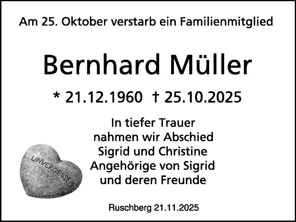 Hier finden Sie alle Traueranzeigen aus der Zeitung, die bisher für Bernhard Müller erschienen sind. Weitere Traueranzeigen, die in der Zeitung erscheinen, werden hier ebenfalls aufgelistet