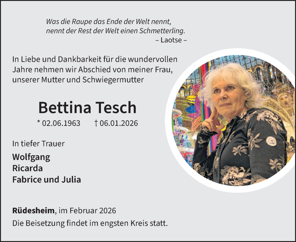 Hier finden Sie alle Traueranzeigen aus der Zeitung, die bisher für Bettina Tesch erschienen sind. Weitere Traueranzeigen, die in der Zeitung erscheinen, werden hier ebenfalls aufgelistet