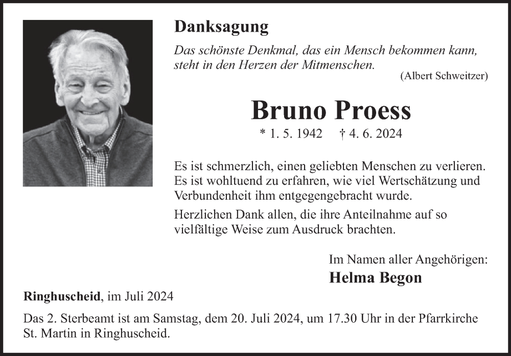 Hier finden Sie alle Traueranzeigen aus der Zeitung, die bisher für Bruno Proess erschienen sind. Weitere Traueranzeigen, die in der Zeitung erscheinen, werden hier ebenfalls aufgelistet