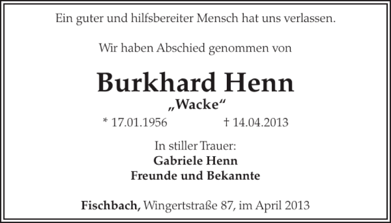 Hier finden Sie alle Traueranzeigen aus der Zeitung, die bisher für Burkhard Henn erschienen sind. Weitere Traueranzeigen, die in der Zeitung erscheinen, werden hier ebenfalls aufgelistet