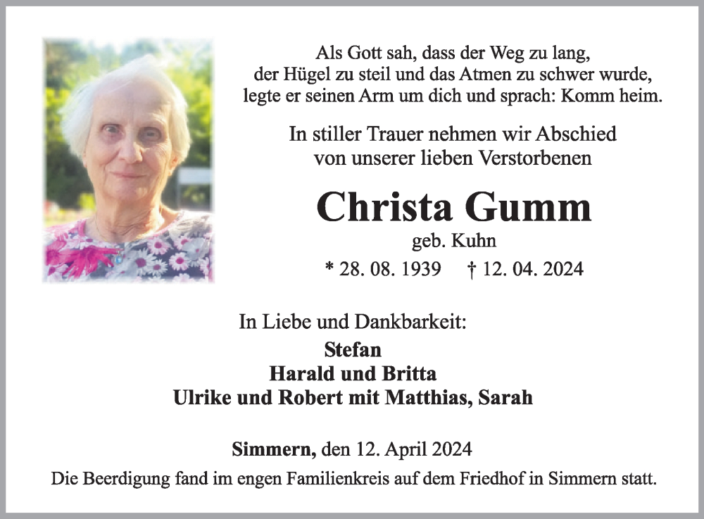 Hier finden Sie alle Traueranzeigen aus der Zeitung, die bisher für Christa Gumm erschienen sind. Weitere Traueranzeigen, die in der Zeitung erscheinen, werden hier ebenfalls aufgelistet