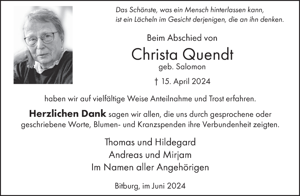 Hier finden Sie alle Traueranzeigen aus der Zeitung, die bisher für Christa Quendt erschienen sind. Weitere Traueranzeigen, die in der Zeitung erscheinen, werden hier ebenfalls aufgelistet