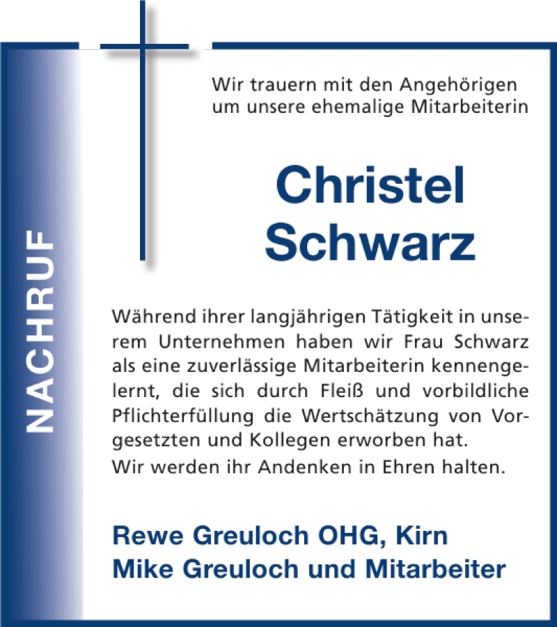 Hier finden Sie alle Traueranzeigen aus der Zeitung, die bisher für Christel Schwarz erschienen sind. Weitere Traueranzeigen, die in der Zeitung erscheinen, werden hier ebenfalls aufgelistet