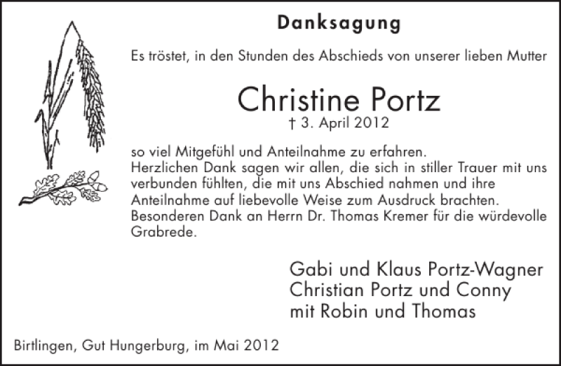 Hier finden Sie alle Traueranzeigen aus der Zeitung, die bisher für Christine Portz erschienen sind. Weitere Traueranzeigen, die in der Zeitung erscheinen, werden hier ebenfalls aufgelistet