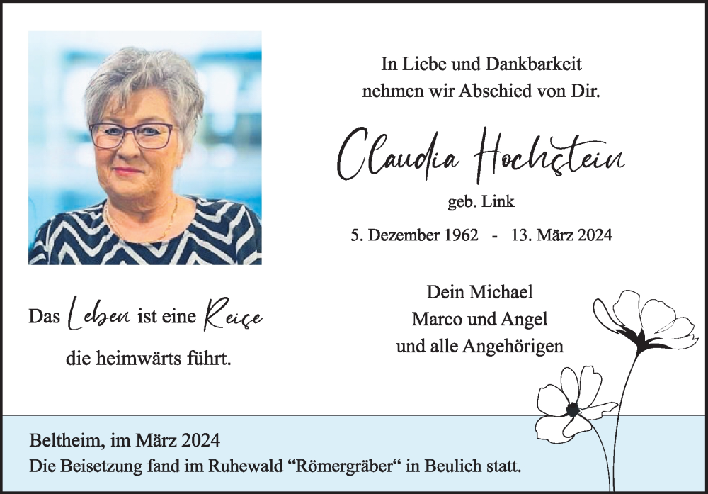Hier finden Sie alle Traueranzeigen aus der Zeitung, die bisher für Claudia Hochstein erschienen sind. Weitere Traueranzeigen, die in der Zeitung erscheinen, werden hier ebenfalls aufgelistet