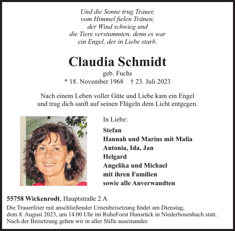 Hier finden Sie alle Traueranzeigen aus der Zeitung, die bisher für Claudia Schmidt erschienen sind. Weitere Traueranzeigen, die in der Zeitung erscheinen, werden hier ebenfalls aufgelistet