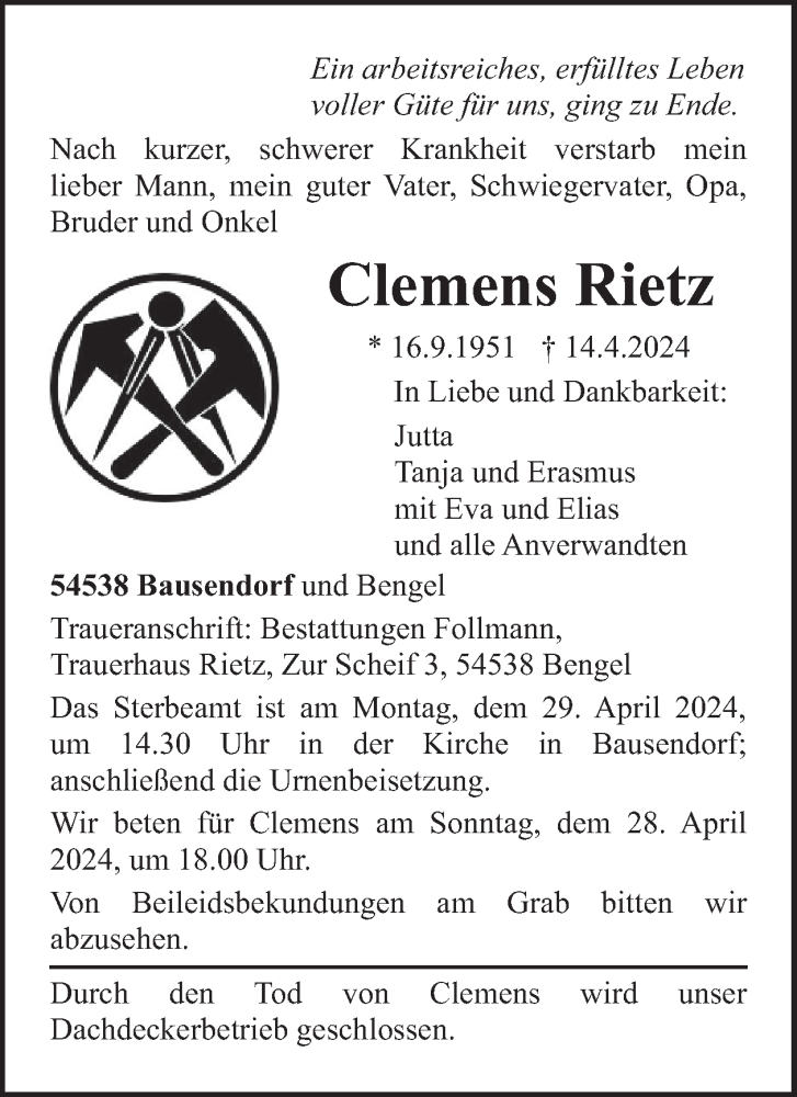 Hier finden Sie alle Traueranzeigen aus der Zeitung, die bisher für Clemens Rietz erschienen sind. Weitere Traueranzeigen, die in der Zeitung erscheinen, werden hier ebenfalls aufgelistet