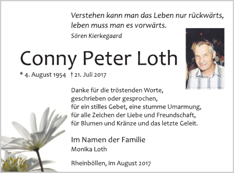Hier finden Sie alle Traueranzeigen aus der Zeitung, die bisher für Conny Peter Loth erschienen sind. Weitere Traueranzeigen, die in der Zeitung erscheinen, werden hier ebenfalls aufgelistet