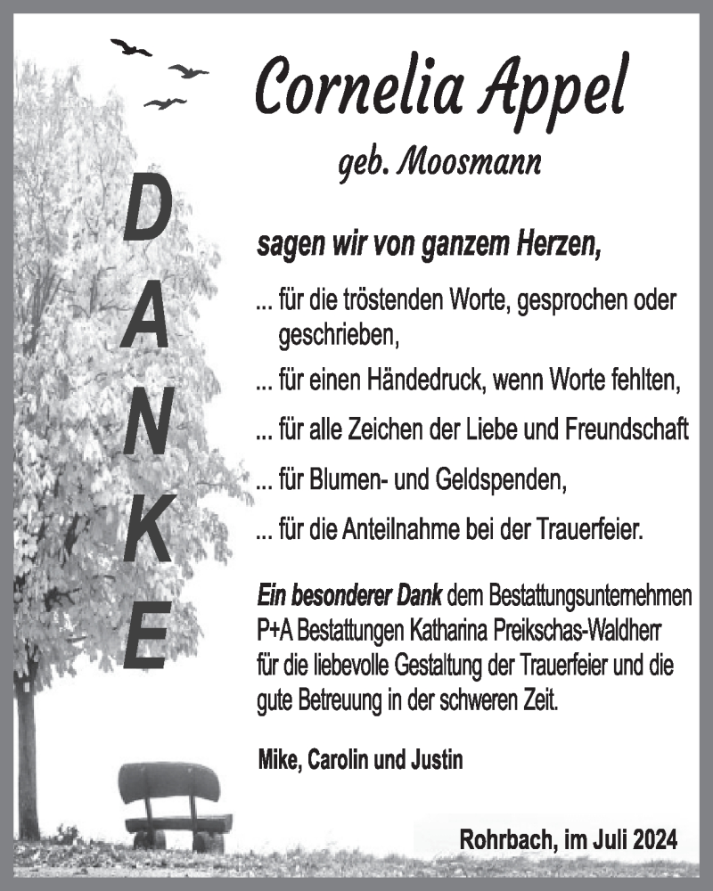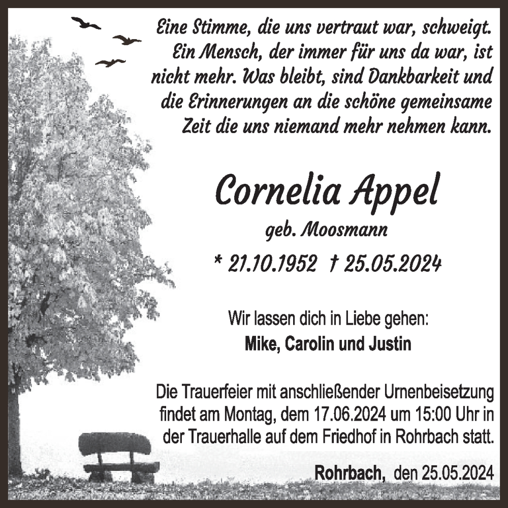 Hier finden Sie alle Traueranzeigen aus der Zeitung, die bisher für Cornelia Appel erschienen sind. Weitere Traueranzeigen, die in der Zeitung erscheinen, werden hier ebenfalls aufgelistet